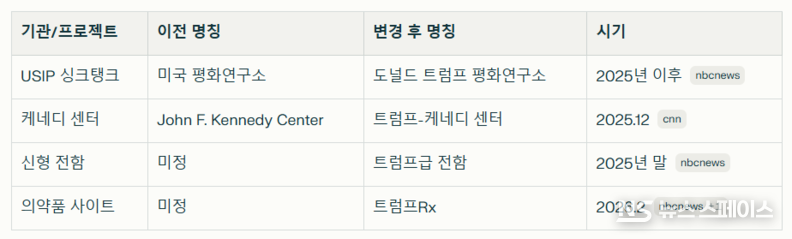 트럼프 대통령은 2기 행정부 출범 후 미국 평화연구소(USIP)를 '도널드 트럼프 평화연구소'로, 케네디 센터를 '트럼프-케네디 센터'로 변경하며 유산 남기기에 열을 올리고 있다.
