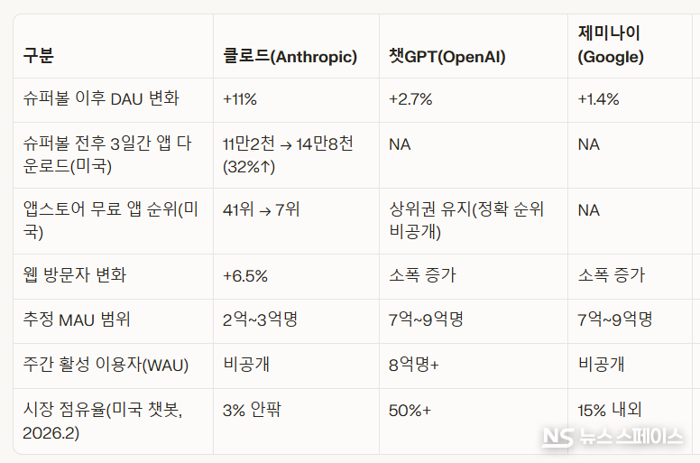 2월 14일(현지시간) CNBC, 테크크런치, ainvest, mexc에 따르면 투자은행 BNP파리바는 앤트로픽이 최근 미식축구 '슈퍼볼'에서 해당 광고를 내보낸 이후 일일활성사용자(DAU)가 11% 급증한 것으로 분석했다. 같은 기간 오픈AI 챗GPT DAU는 2.7%, 구글 제미나이는 1.4% 늘어나는 데 그치며, 단기 성장률만 놓고 보면 클로드가 경쟁사를 압도했다는 진단이다.