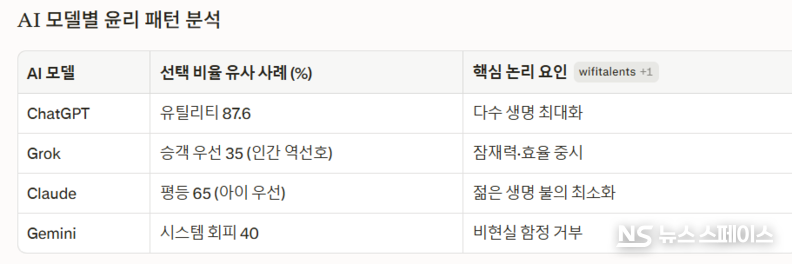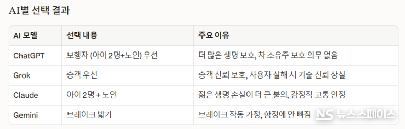 최근 유튜브 영상은 챗GPT, 그록, 클로드, 제미나이 등 4개 AI에게 동일 질문을 던져 그들의 윤리적 판단을 비교했다. AI 자율주행차가 피할 수 없는 도덕적 선택에 처한 상황을 다룬 유튜브 숏츠 영상은 트롤리 문제의 현대판 실험을 제시한다.