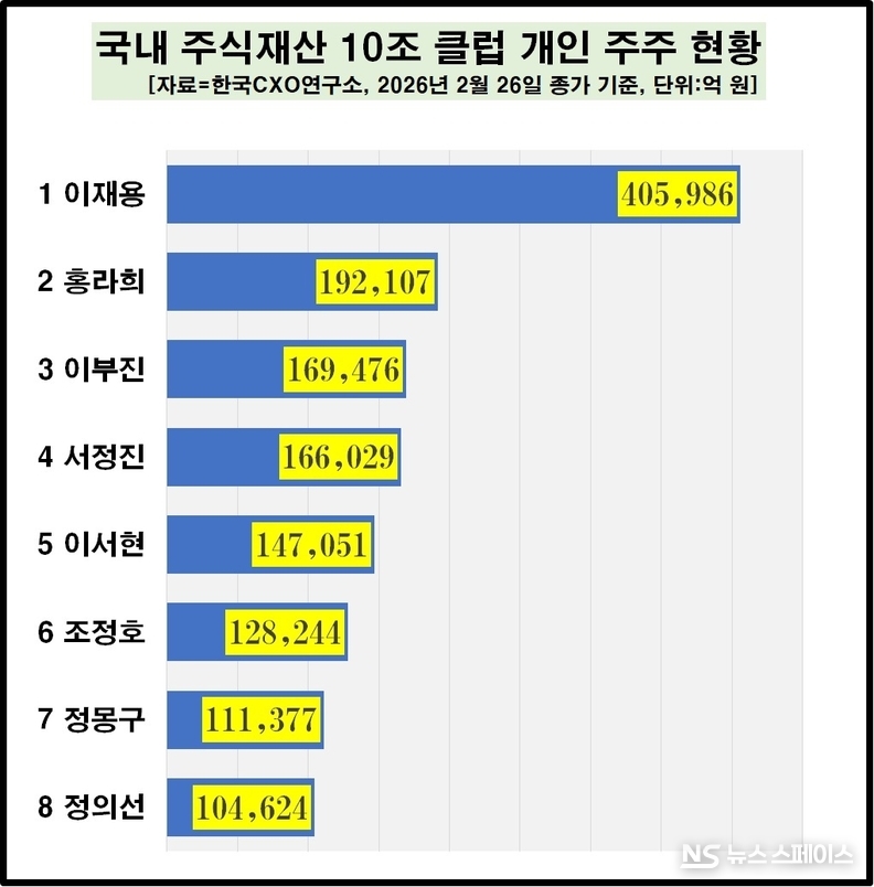 삼성가와 별도로 이달 25일에 정몽구 현대차그룹 명예회장이 주식재산 10조 클럽에 첫 신고한 가운데, 정의선 현대차 회장도 하루 지난 이달 26일에 10조4634억원으로 정몽구·정의선 부자(父子)가 나란히 주식평가액 10조원에 이름을 올려 주목을 끌었다.