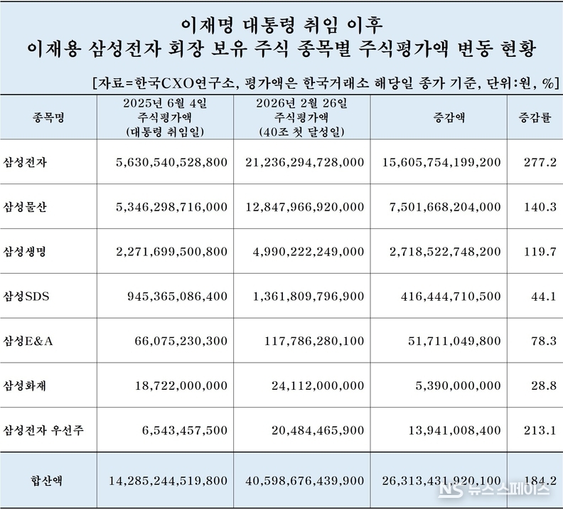 여기에 이달 26일 기준 삼성생명(4조9902억원)과 삼성SDS(1조3618억원)도 조 단위 수준의 주식가치를 보이며 이재용 회장의 주식재산이 40조원을 넘기는 데 힘을 보탰다.