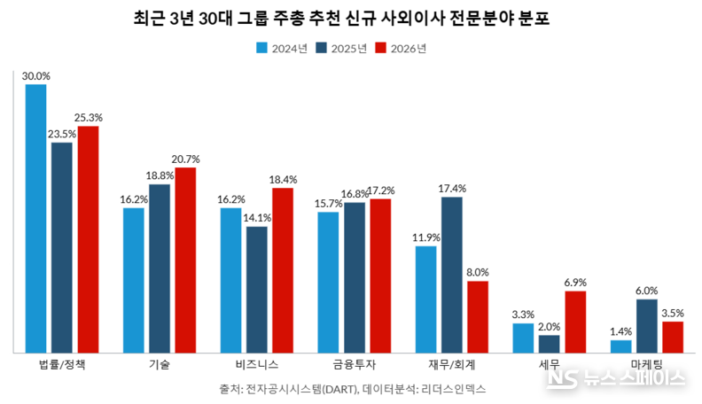 3월 3일 기업분석연구소 리더스인덱스(대표 박주근)가 30대 그룹 계열사 중 지난달 27일까지 2026년 주주총회소집공고서를 제출한 157개사 신규 사외이사 87명과 동일 기업에서 지난해 추천된 신규 사외이사 149명의 출신 이력 및 전문 분야를 비교 분석한 결과 이같은 변화가 확인됐다.