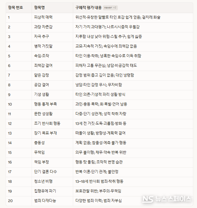 핵심 항목은 4요인(대인·정서·생활·반사회) 중 '정서적 결여(죄책감·공감 상실)'와 '반사회적 행동'으로, 전체 점수의 40%를 차지한다. 한국심리학회지(2024) 논문 16편 분석 결과, 공감 결여 항목(항목 7·8)이 재범 상관계수 r=0.45로 최고이며, 병적 거짓(항목 4)은 조작성 탐지율 85%를 보인다.