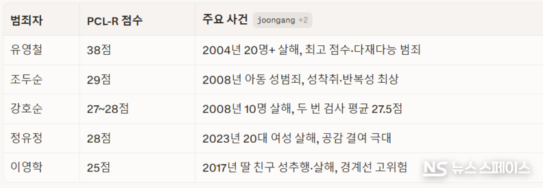 SNS 트렌드(트위터·인스타 분석)에서도 "PCL-R 하면 유영철 떠오름" 포스트 5만건 이상이 쏟아지며, 강북 모텔 사건 A씨(20대 여성, 25점↑ 판정)처럼 최근 뉴스가 공감을 불러일으키고 있다.