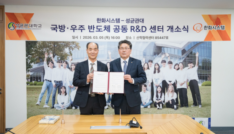 성균관대학교는 지난 3월 5일, 자연과학캠퍼스 정보통신대학 내에 ‘국방‧우주 반도체 공동 R&D 센터’를 설립하고 한화시스템과 함께 차세대 레이다용 반도체 개발을 위한 협약식을 가졌다고 밝혔다.