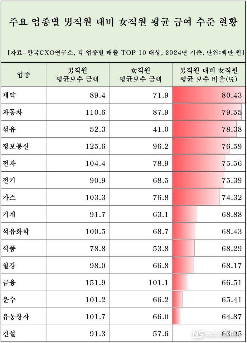 기업분석 전문 한국CXO연구소는 세계 여성의 날(3월 8일)을 맞이해 ‘주요 대기업의 업종별 남녀 직원 수 및 평균 급여 비교 조사’ 내용을 분석해 8일 발표했다. 조사 대상 기업은 상장 회사 중 주요 15개 업종별로 매출 상위 TOP 10(2023년 별도 기준)에 포함되는 총 150개 대기업이다. 조사에 필요한 직원 수와 평균 급여 등은 2024년 사업보고서를 기초 자료로 삼았다. 직원 수는 사업보고서에 명시된 ‘기간의 정함이 없는 근로자’와 ‘기간제 근로자’를 합산한 전체 인원 기준이다. 미등기임원도 직원 조사 대상에 포함됐다. 전체 여직원 평균 급여를 명시하지 않은 기업은 별도 계산을 통해 해당 값을 산출했다.