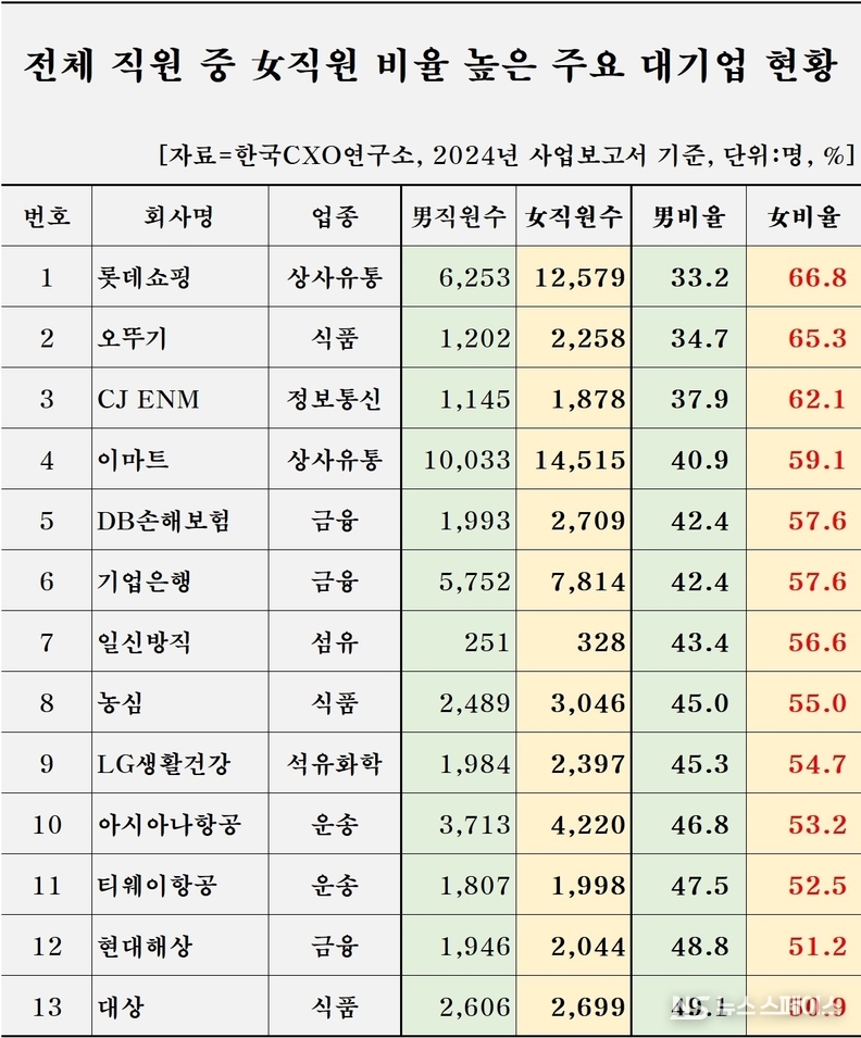 이외 ▲이마트(59.1%) ▲기업은행·DB손해보험(각 57.6%) ▲일신방직(56.6%) ▲농심(55%) ▲LG생활건강(54.7%) ▲아시아나항공(53.2%) ▲티웨이항공(52.5%) ▲현대해상(51.2%) ▲대상(50.9%)도 50%를 상회하며 여성 고용 우수 기업군에 속했다.