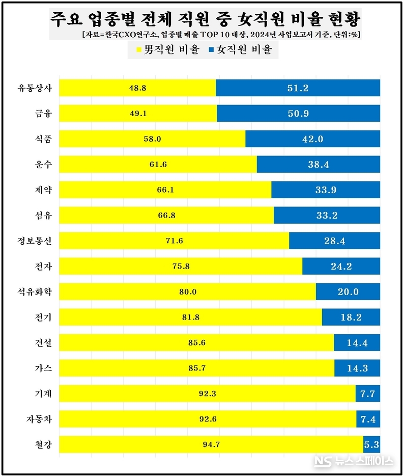 업종별로 살펴보면 여직원 비중은 극과 극을 달렸다. 유통·상사 업종은 여성 직원 비중이 51.2%로 전체 직원의 절반 이상을 차지했다. 조사 대상 10개 주요 유통·상사 관련 업체의 경우 여직원(3만4744명)이 남직원(3만3062명)보다 1682명 이상 많았다. 금융 업종도 여직원 비중이 50.9%로 절반을 넘어선 것으로 파악됐다. 다음으로 ▲식품(42%) ▲운수(38.4%) ▲제약(33.9%) ▲섬유(33.2%) 순으로 여직원 비율이 30% 이상을 보였다.