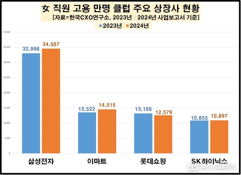 조사 대상 150개 주요 상장사 중 여성 직원을 1만명 이상 고용한 ‘여직원 고용 만명 클럽’에는 4곳이 이름을 올렸다. 이 중에서도 단일 기업 중에서는 삼성전자가 2024년 기준 여직원 숫자만 3만4567명으로 가장 많은 것으로 확인됐다. 지난 2023년 3만2998명이던 것에서 여성 일자리가 더 늘었다. 이어 ▲이마트 1만4515명(2023년 1만3522명) ▲롯데쇼핑 1만2579명(1만3166명) ▲SK하이닉스 1만897명(1만855명)도 여성 직원을 1만명 넘게 고용하고 있는 것으로 나타났다.