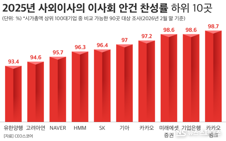 3월 18일 기업데이터연구소 CEO스코어(대표 조원만)가 2024년부터 2025년까지 시총 상위 100대 기업 중 비교 가능한 90곳의 이사회 안건과 의결현황, 사외이사의 출석률·찬성률을 분석한 결과, 이들 기업 사외이사의 지난해 이사회 안건 찬성률은 전년 대비 0.03%포인트 오른 99.49%에 달했다.
