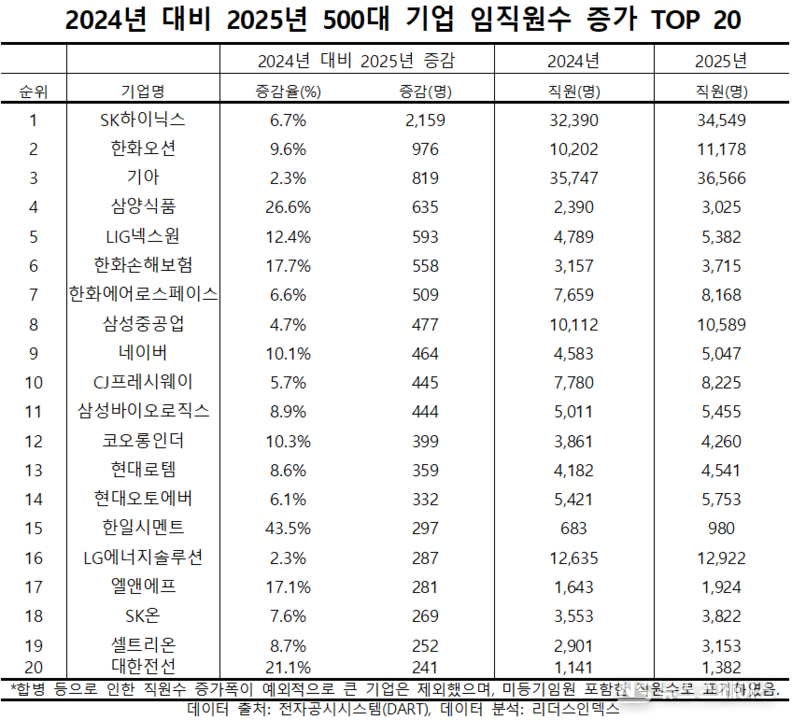 한편 개별 기업 기준으로 가장 많은 임직원이 증가한 곳은 SK하이닉스였다. 3만2390명에서 3만4549명으로 2159명(6.7%) 증가했다. 이와 함께 한화오션 976명(9.6%), 기아 819명(2.3%), 삼양식품 635명(26.6%), LIG넥스원 593명(12.4%), 한화손해보험 558명(17.7%) 등도 임직원 증가폭이 두드러졌다.