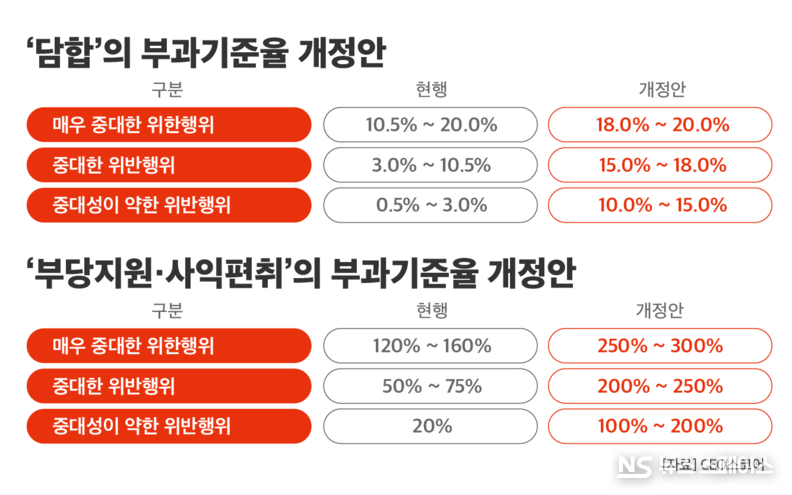 공정위는 담합 등 공정거래법 위반 행위에 대한 과징금 부과 기준을 전반적으로 강화할 방침이다. 개정안에 따르면 담합의 경우 위반 정도에 따라 부과기준율이 기존 0.5%~3.0%에서 10.0%~15.0%로, 3.0%~10.5%에서 15.0%~18.0%로 각각 상향된다. 매우 중대한 위반 행위의 하한 기준도 10.5%에서 18.0%로 높아진다.