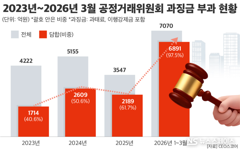 4월 1일 기업데이터연구소 CEO스코어(대표 조원만)가 2023년 1월부터 2026년 3월 20일까지 3년여 간 공정위 제재 현황을 분석한 결과, 올해 공정위가 기업에 부과한 과징금은 총 7070억원으로 나타났다. 이는 2025년 연간(3547억원) 대비 99.3%나 급증한 수준이자, 최근 3년 중 최대치다.