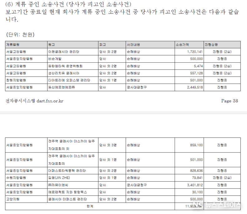 가장 큰 소송은 ㈜까뮤이앤씨가 제기한 공사대금청구 소송으로 소송가액은 34억200만원이다. 동신에프앤에프㈜의 공사대금청구 소송도 24억5,000만원 규모다. 이천클래시아 관리단이 제기한 손해배상 소송은 17억2,000만원(서울고등법원 2심 진행 중), 전주역 클래시아 더스카이 입주자대표회의 외의 손해배상 소송은 8억5,900만원, 더퍼스트타워평택 관리단의 손해배상 소송은 8억2,900만원이다.