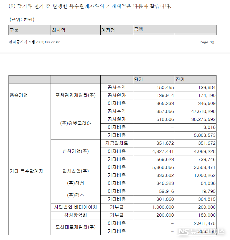 단기차입금 1,085억원 중 연세산업㈜ 800억원, ㈜창성 100억원, 남동공단제일㈜ 150억원이 특수관계자 차입이다. 장기차입금 1,209억3,400만원 중에서는 신창기업(주) 976억원, 연세산업(주) 142억원, 포항광명제일차(주) 78억3,400만원, ㈜팸스 13억원이 특수관계자 차입이다. 유동성장기부채 중 신창기업(주) 39억원도 포함된다. 특수관계자 차입금만 합산하면 약 1,972억원에 이른다.