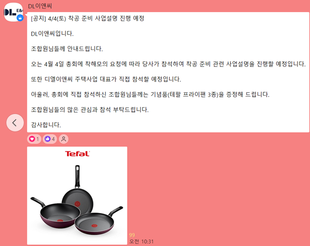 3일 업계에 따르면 DL이앤씨는 최근 상대원2구역 조합원에게 "4월 4일 총회에 착해모(상대원2구역 비대위)의 요청에 따라 당사가 참석해 착공 준비 관련 사업설명을 진행할 예정"이라며 "종회에 직접 참석하는 조합원에게는 기념품(테팔 프라이팬 3종)을 증정해 드린다"고 안내했다. 그러면서 "DL이앤씨 주택사업대표가 직접 참석할 예정"이라고 덧붙였다.