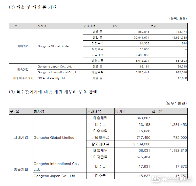 이와 함께 본사에 지급하는 로열티 부담도 만만치 않다. 공차코리아는 지배기업인 Gongcha Global Limited와 국내 브랜드 판권 계약 및 식자재 공급 계약을 맺고 있으며, 당기 중 지배기업으로부터 309억4,167만원 규모의 매입 거래를 진행했다. 이는 전체 매출원가의 상당 부분을 차지하는 규모로, 본사에 대한 높은 의존도와 국부 유출 논란을 피하기 어려워 보인다.