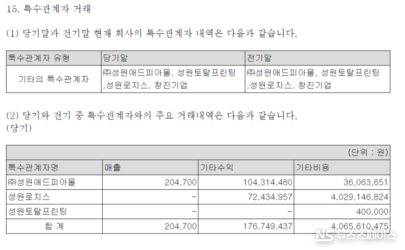 특히 성원로지스와의 비용 거래는 40억원대를 유지하고 있어, 물류 부문에서의 내부 거래 의존도가 여전히 높다. 이러한 특수관계자 거래는 시장 가격과의 차이 여부, 거래 조건의 공정성 등에 대한 외부의 검증이 어렵다는 점에서 지속적인 모니터링이 필요하다.