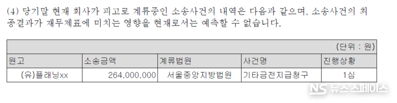 감사보고서에 따르면, 성원애드피아는 현재 (유)플래닝xx로부터 2억6400만원 규모의 기타금전지급청구 소송(1심)을 피고로서 진행 중이다. 소송 금액 자체가 기업 규모 대비 크지는 않으나, 감사인은 “소송사건의 최종 결과가 재무제표에 미치는 영향을 현재로서는 예측할 수 없다”고 명시했다. 패소시 재무적 손실은 물론 기업 평판에도 부정적 영향을 미칠 수 있다.