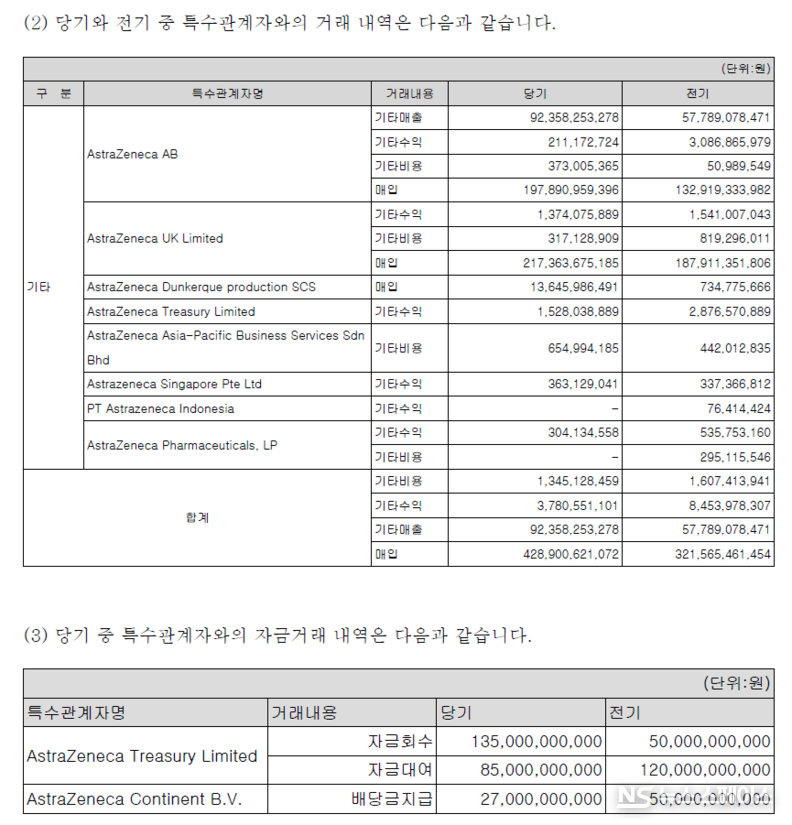 특수관계자와의 자금거래도 활발하게 이루어졌다. 회사는 영국 소재 계열사(AstraZeneca Treasury Limited)에 850억원을 대여하고 1,350억원을 회수하는 등 대규모 자금 거래를 진행했다.