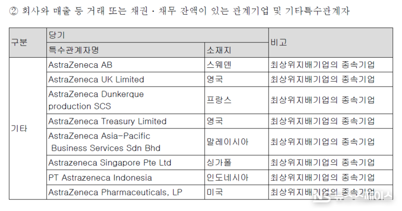 또한, 영국 본사(AstraZeneca UK Limited) 및 스웨덴 법인(AstraZeneca AB) 등 특수관계자와의 거래 규모도 막대하다. 2025년 특수관계자로부터의 매입액은 총 4,289억원으로, 전년(3,215억원) 대비 33.4% 급증했다. 이는 한국아스트라제네카의 전체 매출원가(4,957억원)의 86.5%를 차지하는 규모다. 다국적 제약사들이 국내에서 벌어들인 수익을 본사 제품의 고가 매입이나 로열티 명목으로 이전한다는 비판에서 자유롭기 어려운 대목이다.