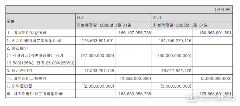 2025년 당기순이익이 175억원에 불과하다는 점을 감안하면, 한 해 벌어들인 순이익을 훌쩍 뛰어넘는 금액을 본사에 배당으로 송금한 셈이다. 배당성향(당기순이익 대비 배당금 비율)은 무려 154%에 달한다.