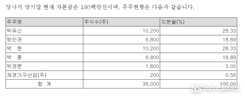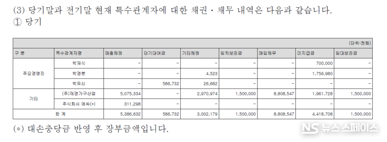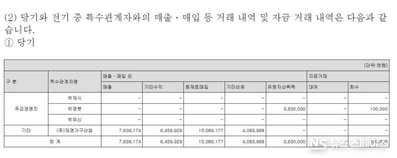 오너 일가와의 부동산 거래도 눈길을 끈다. 2025년 중 박경분 대표이사로부터 36억3000만원 규모의 유형자산을 취득했으며, 전년도에도 박재식 사내이사와 박경분 대표이사로부터 각각 35억원씩, 총 70억원 규모의 유형자산을 매입한 바 있다. 이는 경영진이 보유한 부동산을 회사가 매입하는 방식으로, 오너 일가에 대한 자금 유출 경로로 기능할 수 있다는 점에서 투명성 논란이 제기될 수 있다.