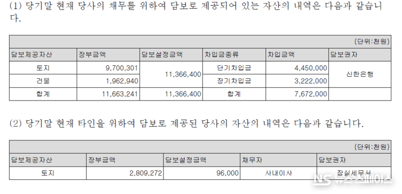 아울러 대표이사는 자코모의 영업보증금 22억5000만원(에이스침대 담보)에 대해 부동산 담보를 제공하고 있으며, 자코모의 토지(장부가액 28억원)는 사내이사의 세금 채무(잠실세무서)를 위한 담보로 제공되어 있어 회사 자산이 개인 채무 담보로 활용되는 구조적 문제도 확인된다.