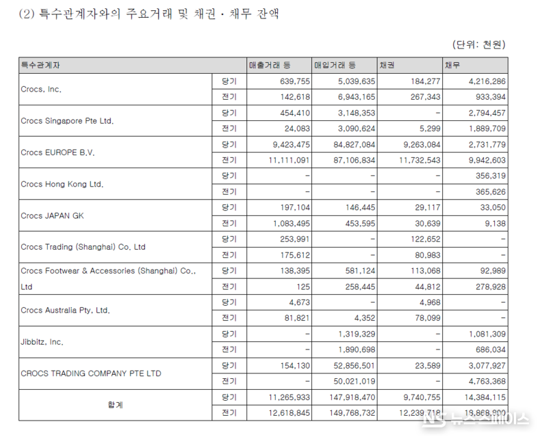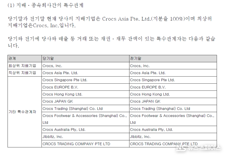 직상위 지배기업인 Crocs Asia Pte. Ltd.를 비롯해 싱가포르, 유럽, 홍콩, 일본, 상하이 등 전 세계 크록스 관계사들과 거미줄처럼 얽힌 거래망을 통해 제품을 들여오고 있다. 특히 싱가포르 법인(Crocs Singapore Pte Ltd.)으로부터 528억원, 크록스 트레이딩 컴퍼니(CROCS TRADING COMPANY PTE LTD)로부터 848억원어치를 매입했다.