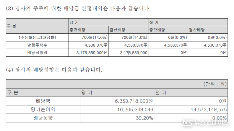 감사보고서에 따르면 피죤은 2025년 회계연도에 대해 주당 700원(배당률 14.0%)의 현금배당을 실시하기로 했다. 중간배당 31억7,600만원과 결산배당 31억7,600만원을 합쳐 총 배당금은 63억5,300만원에 달한다. 이는 당기순이익(162억원)의 39.2%에 해당하는 규모다. 전년도에는 배당을 전혀 실시하지 않았으나, 이익이 늘자 대규모 배당 잔치를 벌인 셈이다.