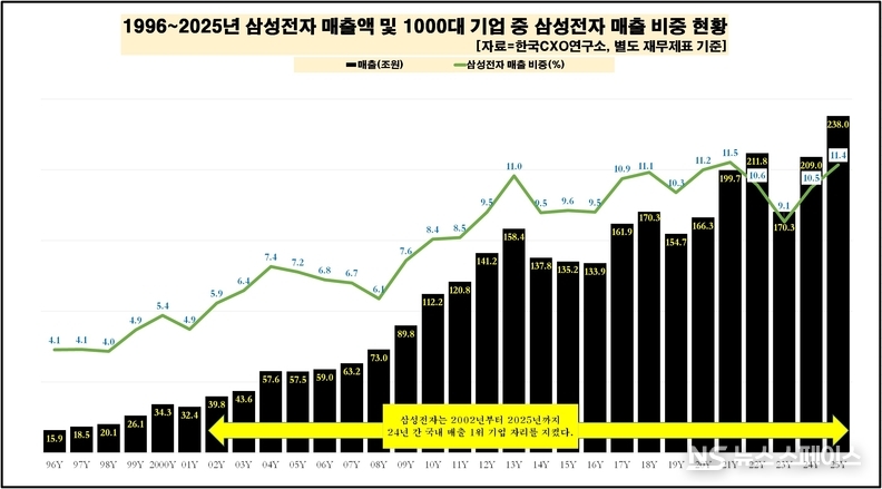 ◆ 삼성전자, 작년 매출 238조원으로 역대 최고…지난해 1000대 기업 매출 영향력은 11.3%