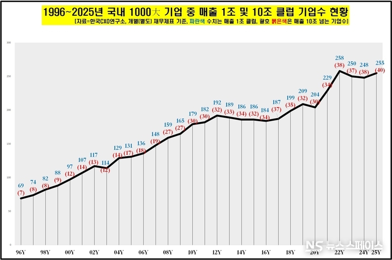 작년 기준 매출 10조 클럽에 가입한 기업 숫자는 40곳으로 지난 1996년 이후 조사 가장 많아졌다. 특히 ▲삼성중공업(24년 매출 9조8674억원→25년 매출 10조6349억원)과 ▲고려아연(8조890억원→10조5342억원)도 지난해 별도 기준 매출 10조 클럽에 입성한 것으로 나타났다.
