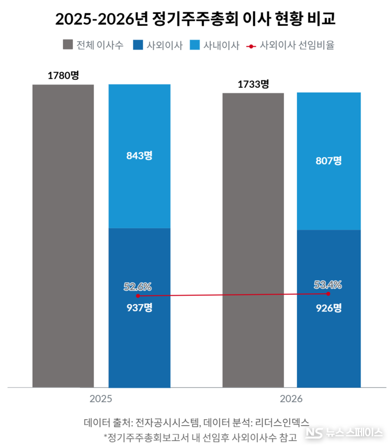 4월 7일 리더스인덱스(대표 박주근)가 50대 그룹 상장사 중 전년도와 비교 가능한 269개사 주총 결과를 분석한 결과, 올해 주총 이후 전체 이사 수는 총 1733명으로 집계됐다. 전년(1780명) 대비 47명(2.6%) 감소한 수치다.