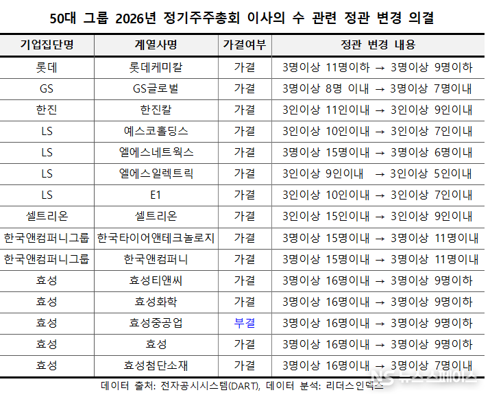 정관 변경을 통해 이사 수를 조정한 케이스를 그룹별로 보면 효성이 5개 계열사(효성, 효성티앤씨, 효성화학, 효성중공업, 효성첨단소재)로 가장 많았다. 이 가운데 효성중공업은 해당 안건이 부결됐다. 또 LS 4개(LS일렉트릭, LS네트웍스, E1, 예스코홀딩스), 한국앤컴퍼니 2개(한국앤컴퍼니, 한국타이어앤테크놀로지) 등이 뒤를 이었고 한진(한진칼), GS(GS글로벌), 롯데(롯데케미칼), 셀트리온(셀트리온) 등도 포함됐다.