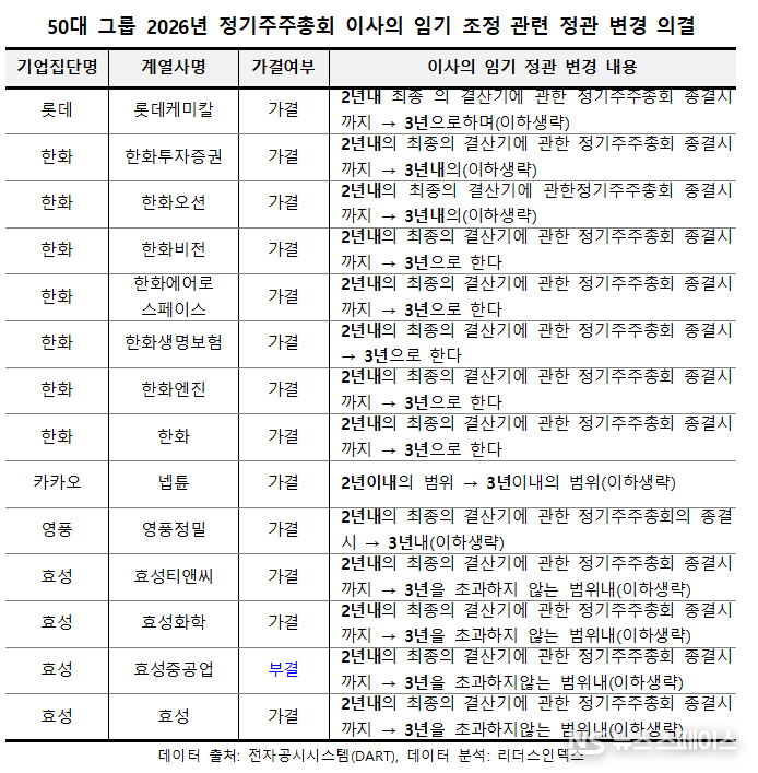 정관상 이사 임기를 조정한 기업은 14곳으로 집계됐다.