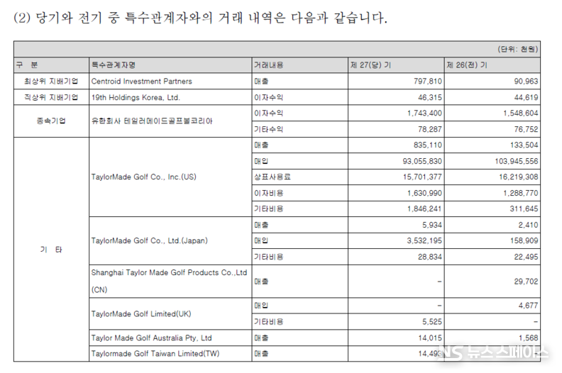 또한, 테일러메이드코리아는 미국 본사로부터 98억 2,341만원 규모의 장기차입금을 끌어다 쓰고 있으며, 이에 대한 이자비용으로만 16억 3,099만원을 지출했다. 매입채무 잔액 역시 366억 5,727만원에 달해 본사에 대한 재무적 의존도가 매우 높은 상황이다.