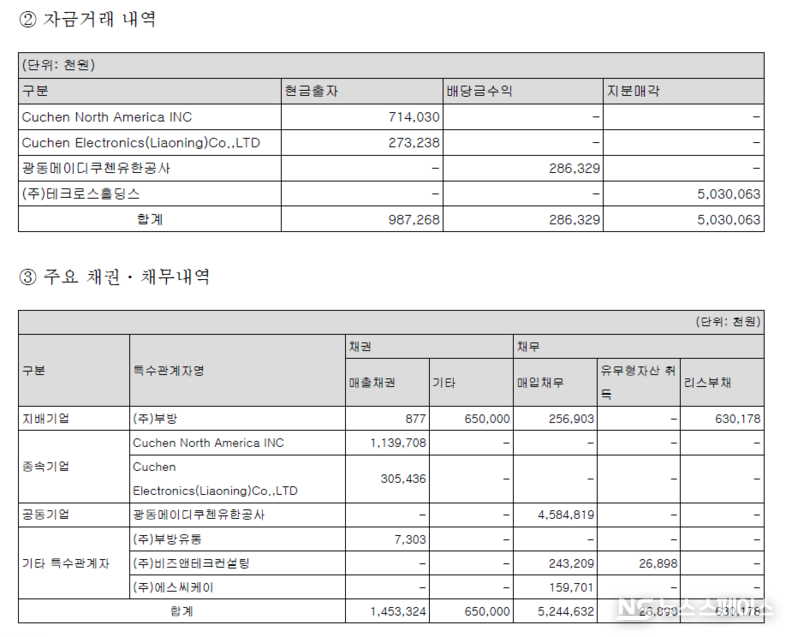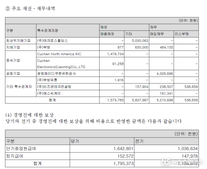 이처럼 주요 부품·제품 소싱의 상당 부분을 특수관계자에 의존하는 구조는, 거래 조건의 독립성 및 가격 적정성에 대한 검증이 어렵다는 점에서 지배구조 리스크로 작용한다. 또한 지배기업인 (주)부방에 대한 기타 채무(기술사용료 등)가 6억 5,000만원에 달하며, 이연법인세자산으로 인식하지 않은 기술사용료 관련 차감할 일시적차이가 6억 5,085만원으로 남아 있다.