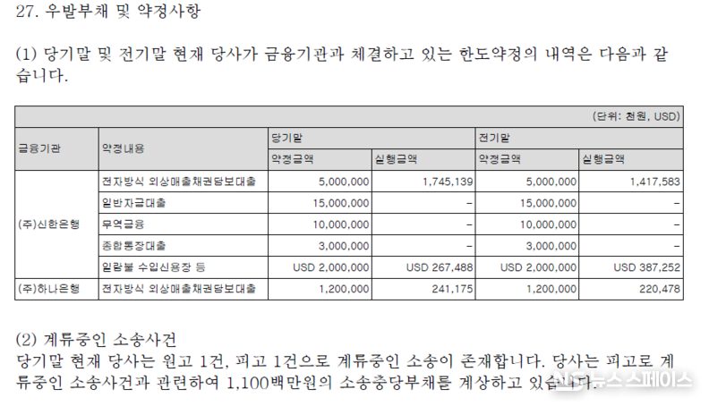 당기말 현재 쿠첸은 원고 1건, 피고 1건의 소송이 계류 중이며, 피고로 계류 중인 소송사건과 관련하여 11억원의 소송충당부채를 계상하고 있다. 전기(9억원) 대비 2억원 증가한 수치로, 소송 리스크가 확대되는 추세다. 소송충당부채 외에도 판매보증충당부채 6억 2,212만원, 반품충당부채 8억 9,998만원 등 총 26억 2,210만원의 충당부채가 계상되어 있다.