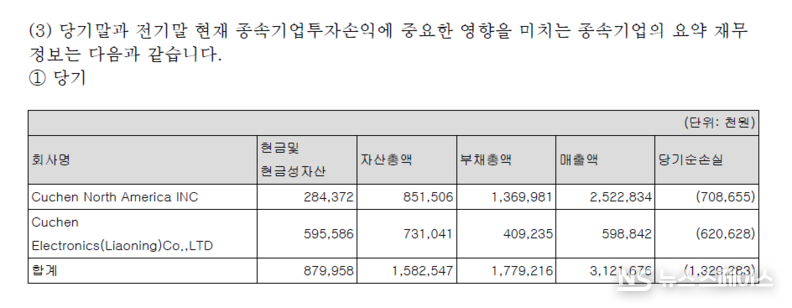 이번 실적 악화의 결정적 원인은 해외 종속기업에 대한 대규모 손상차손 인식이다. 쿠첸은 미국 법인(Cuchen North America INC)과 중국 법인(Cuchen Electronics(Liaoning)Co.,LTD) 두 곳의 종속기업 투자주식에 대해 총 29억 1,046만원의 손상차손을 기타비용으로 인식하며 장부가액을 전액 '0원'으로 처리했다.