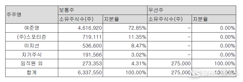 프레인글로벌의 최대주주는 지분 72.85%를 보유한 여준영 대표다. 2대 주주인 ㈜스포티즌이 11.35%, 이지선이 8.47%를 보유하고 있다. 배당과 함께 자기주식 취득도 병행됐다. 2025년 중 3만3,713주를 3억3,593만원에 추가 취득해 자기주식 총 191,566주(장부금액 5억8,810만원)를 보유하게 됐다.