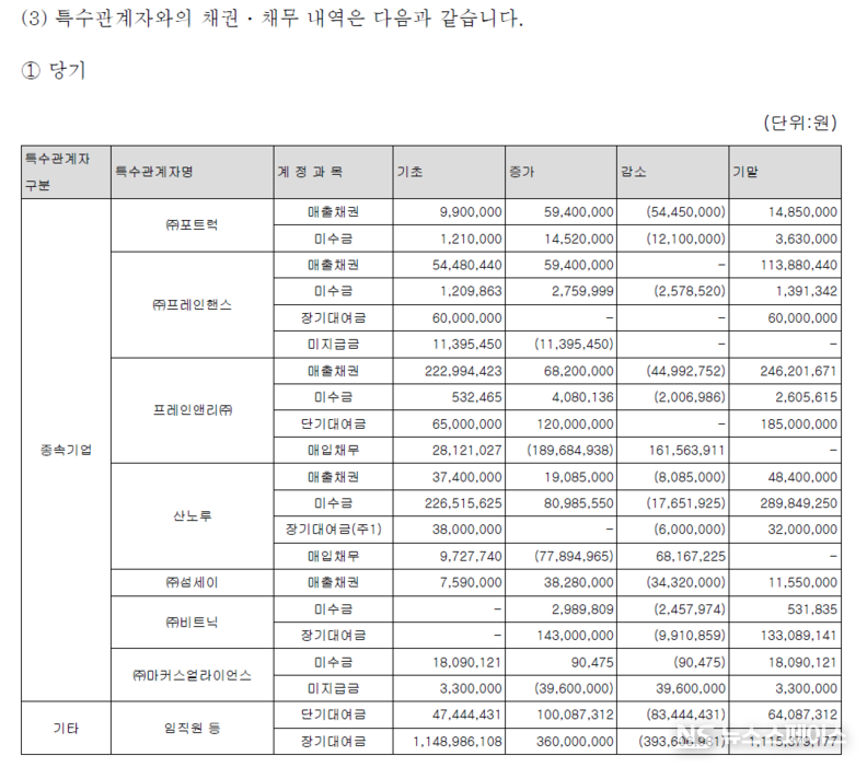 특수관계자와의 자금 거래도 주목된다. 프레인글로벌은 종속기업 및 임직원 등 특수관계자에 대한 대여금을 상당 규모 유지하고 있다. 임직원 등에 대한 단기대여금 6,408만원, 장기대여금 11억1,537만원이 잔존하고 있으며, 프레인앤리에 대한 단기대여금 1억8,500만원, 산노루에 대한 장기대여금 3,200만원(전액 대손충당금 설정) 등도 포함된다.