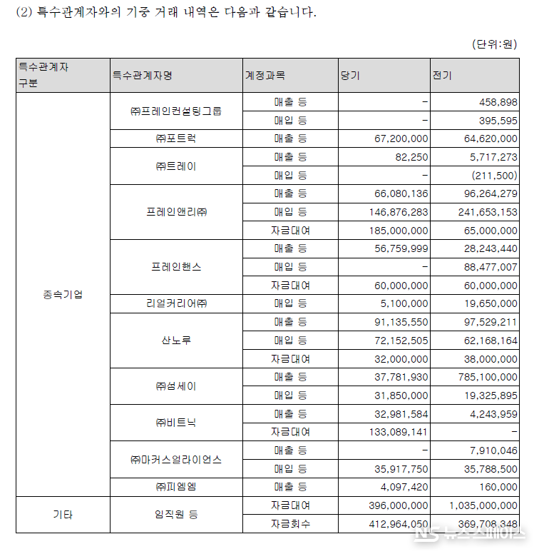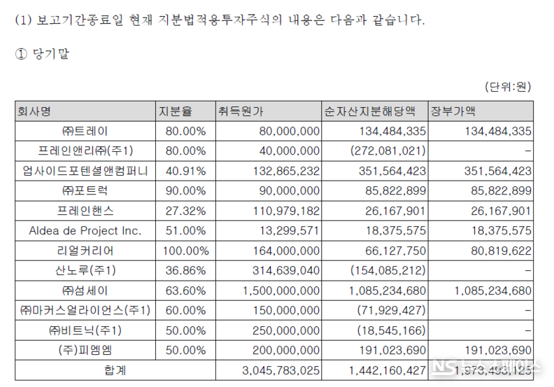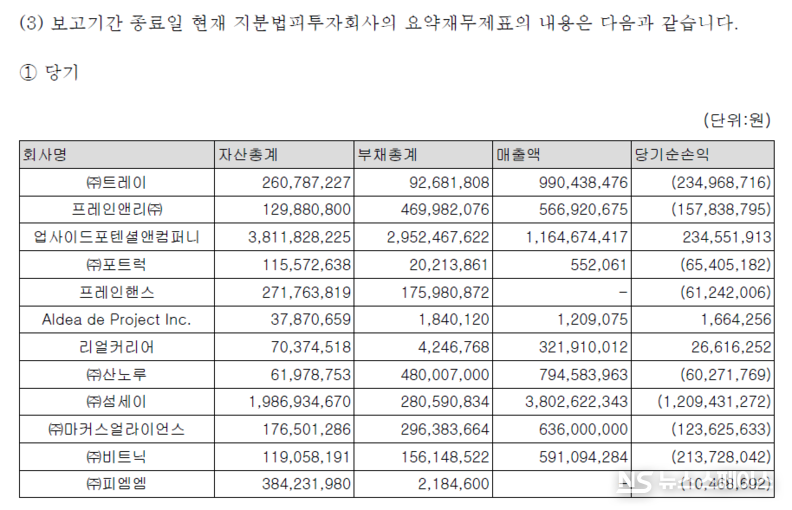 이 외에도 프레인앤리, 프레인핸스, 산노루 등 다수의 종속기업이 적자를 면치 못하고 있다. 일부 종속기업의 경우 순자산지분해당액이 0 이하로 감소하면서 지분법 적용이 중단되는 등 투자 실패의 민낯이 고스란히 드러났다. 신사업 진출과 사업 다각화를 명분으로 단행한 투자가 오히려 본사의 재무적 부담으로 돌아오고 있는 형국이다.