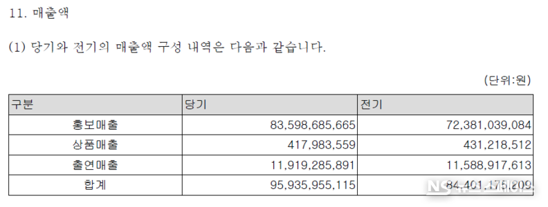 4월 7일 금융감독원 전자공시시스템에 등록된 프레인글로벌의 2025년 감사보고서(회계법인 새시대, 2026년 3월 27일)에 따르면, 회사의 2025년 매출액은 959억3,595만원으로 전년(844억117만원) 대비 13.6% 증가했다. 주력 사업인 홍보 부문 매출이 835억9,868만원으로 전년 대비 15.5% 늘어나며 전체 외형 성장을 견인했다. 출연 매출도 119억1,928만원으로 전년(115억8,891만원) 대비 2.8% 소폭 증가했다.
