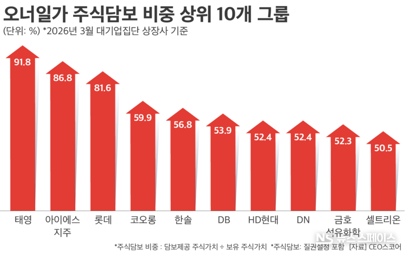 이 밖에 오너일가 담보 비중 상위 10위권 그룹으로는 ▲코오롱 59.9% ▲한솔 56.8% ▲DB 53.9% ▲HD현대 52.4% ▲DN 52.4% ▲금호석유화학 52.3% ▲셀트리온 50.5%로 각각 집계, 담보 비중이 절반을 넘는 그룹이 총 10개에 달했다.