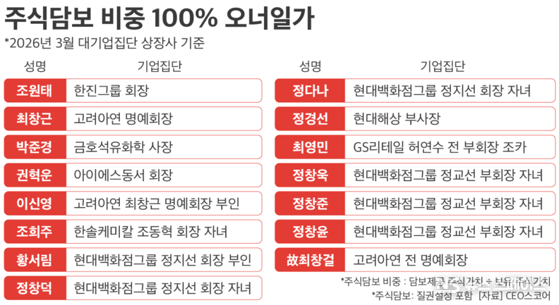 오너일가 가운데 보유 주식 100%를 담보로 제공한 이는 15명으로 ▲조원태 한진그룹 회장 ▲최창근 고려아연 명예회장 ▲박준경 금호석유화학 사장 ▲권혁운 아이에스동서 회장 ▲이신영씨(최창근 명예회장 부인) ▲조희주씨(조동혁 한솔케미칼 회장 자녀) ▲황서림씨(정지선 현대백화점 회장 부인) ▲정창덕·다나씨(정지선 회장 자녀) ▲정경선 현대해상 부사장 ▲최영민씨(허연수 GS리테일 전 부회장 조카) ▲정창욱·창준·창윤군(정교선 현대백화점 부회장 자녀) ▲최창걸 고려아연 전 명예회장 등이 포함됐다.