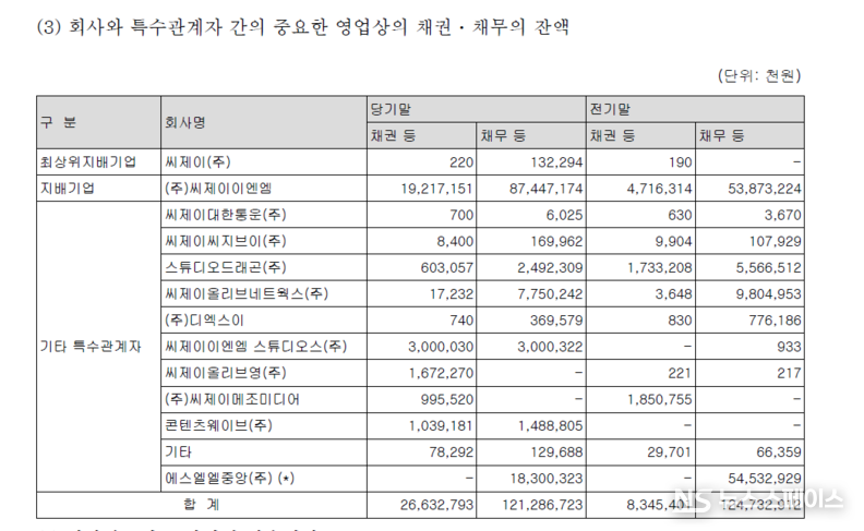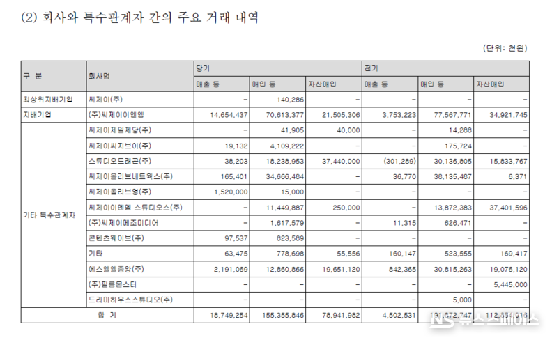세부적으로는 지배기업인 CJ ENM으로부터 706억원의 매입과 215억원의 자산매입이 발생했으며, 스튜디오드래곤과도 182억원의 매입 및 374억원의 자산매입 거래를 진행했다. 오리지널 콘텐츠 제작과 수급을 계열사에 크게 의존하는 구조 탓에, 티빙의 적자가 사실상 그룹 내 콘텐츠 제작사들의 수익으로 이전되는 '착시 효과'가 발생하고 있다는 지적도 제기된다.