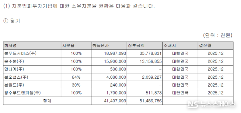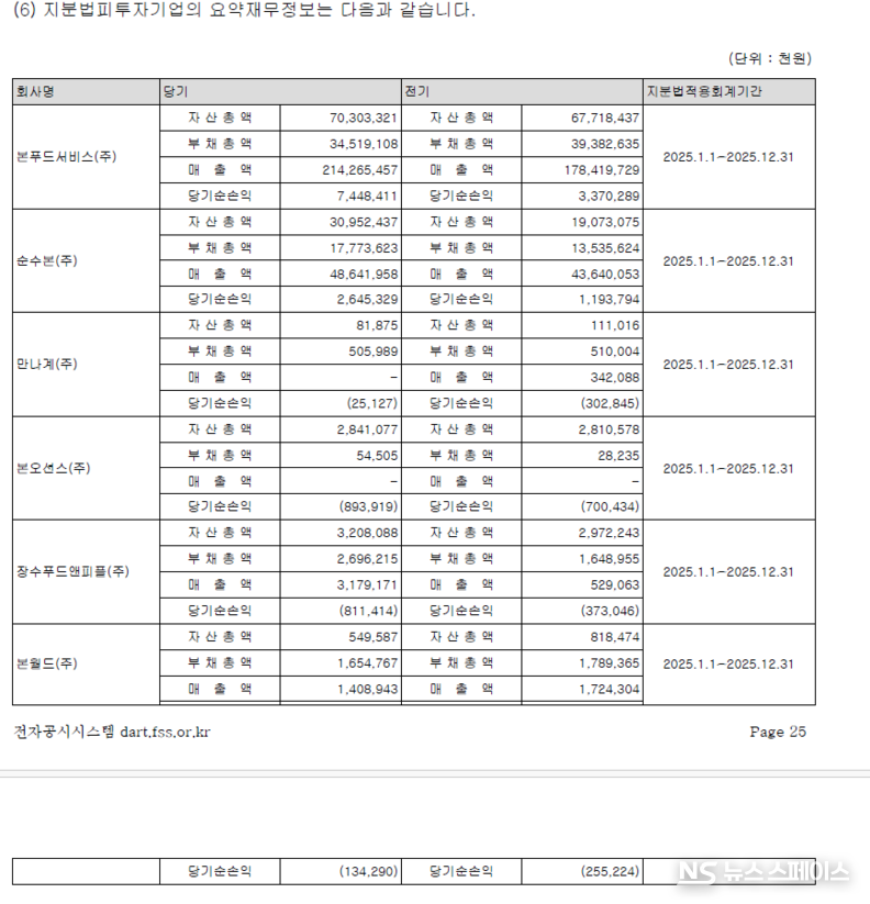 또한, 당기 중 종속기업인 순수본(주)에 50억원을 현금 출자했으며, 관계기업인 본오션스(주)에도 9억원을 추가 출자했다. 특수관계자에 대한 자금 대여 규모는 44억원에 달하며, 기말 현재 대여금 잔액은 33억 4461만원으로 집계됐다. 이 중 만나계(주)와 본월드(주)에 대한 대여금 합계 8억원은 전액 대손충당금이 설정된 상태로, 사실상 회수 불가능한 채권이다.