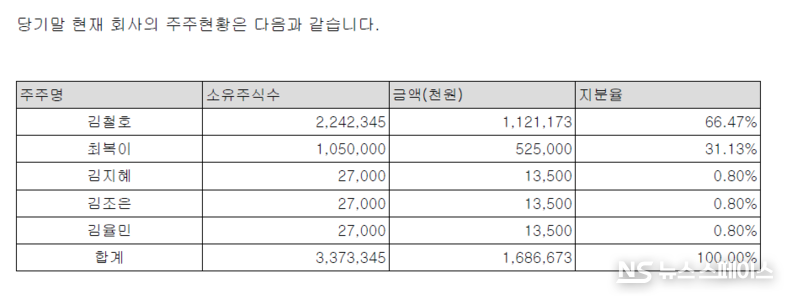 본아이에프의 주주 현황을 보면, 김철호 회장이 보통주 2,242,345주(66.47%)를 보유하고 있으며, 최복이 씨가 1,050,000주(31.13%)를 소유하고 있다. 나머지 지분도 자녀들인 김지혜·김조은·김율민 씨가 각 0.80%씩 보유해 오너 일가가 지분 100%를 독점하고 있다.