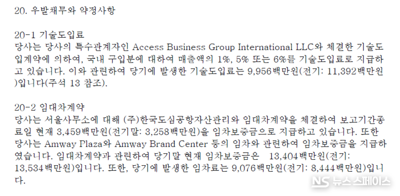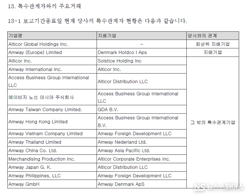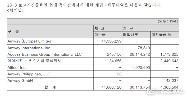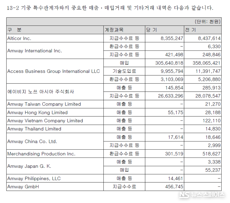 한국암웨이의 가장 큰 페인포인트(Pain Point)는 실적 부진 속에서도 지속되는 대규모 국부 유출이다. 감사보고서 주석에 따르면, 한국암웨이는 미국 본사인 'Access Business Group International LLC' 등 특수관계자들과의 거래를 통해 막대한 자금을 해외로 송금하고 있다.