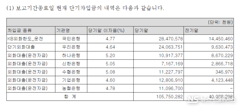 재무건전성 측면에서 가장 심각한 수치는 단기차입금 급증이다. 2025년 말 기준 단기차입금은 1057억 5000만원으로, 전년(400억 9000만원) 대비 163.8% 폭증했다. 국민은행(284억 7000만원), 우리은행(240억 6000만원), 기업은행(128억 700만원), 수협은행(112억 3000만원), 농협은행(110억 9700만원), 하나은행(109억 2000만원), 신한은행(71억 7000만원) 등 7개 시중은행에서 연 4.60~5.20%의 이자율로 전량 외화대출(외화한도·운전자금) 형태로 조달됐다. 환율 변동에 그대로 노출된 외화차입 구조라는 점에서 환 리스크도 잠재적 위협 요인이다.